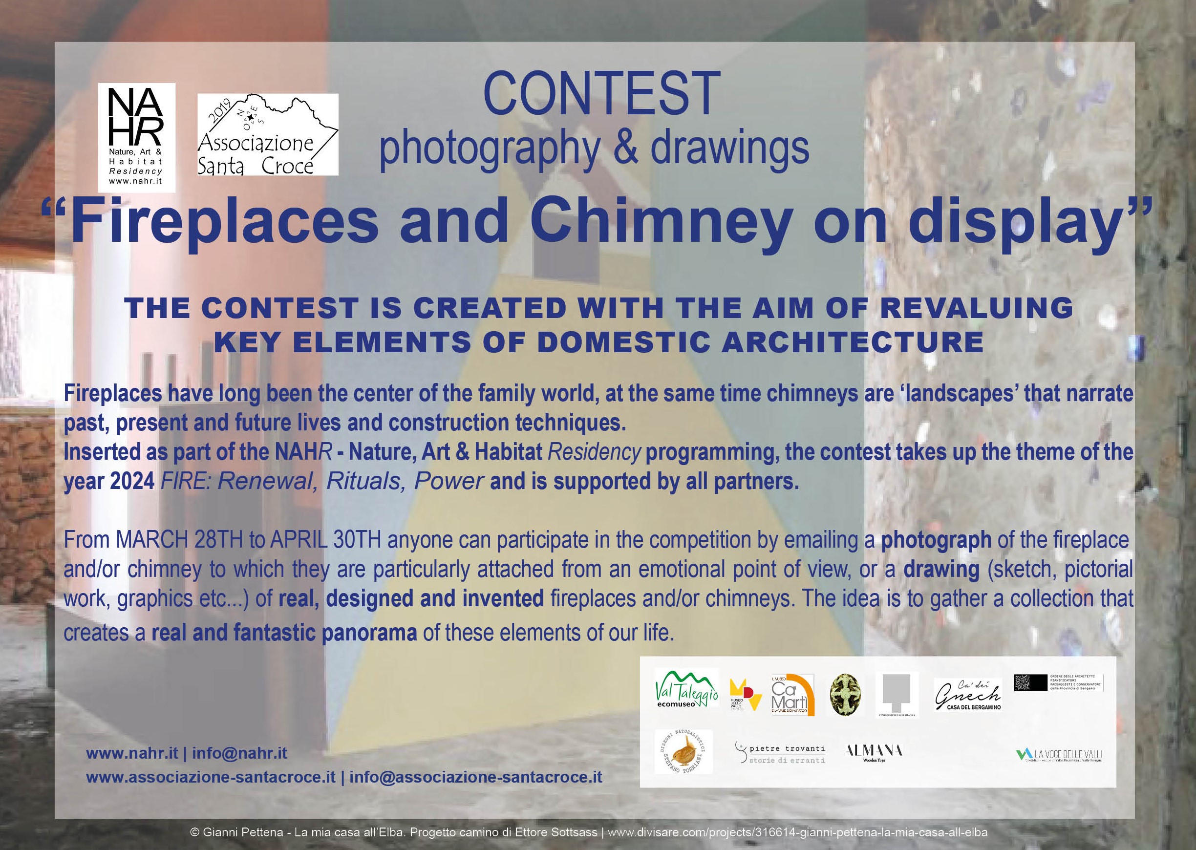 Fireplaces and chimneys on display is created with the aim of revalue key elements of domestic architecture. Fireplaces have long been the center of the family world, at the same time chimneys are 'landscapes' that narrate past, present and future lives and construction techniques. Inserted as part of the NAHR - Nature, Art & Habitat Residency programming, the contest takes up the theme of the year 2024 FIRE: Renewal, Rituals, Power and is supported by the network of promoting and participating bodies.
