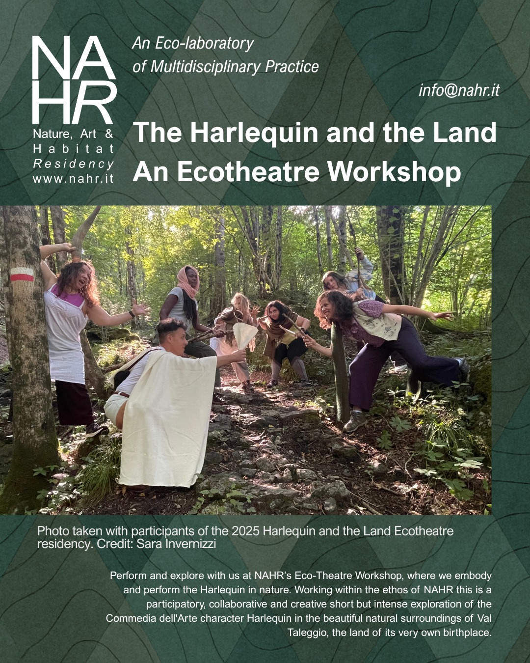 Partecipa al Workshop di Eco-Teatro di NAHR, dove incarniamo e mettiamo in scena L’Arlecchino in natura. Lavorando a passo con la filosofia di NAHR, questo workshop creativo, partecipativo, collaborativo e’ incentrato sul personaggio della Commedia dell'Arte: Arlecchino nello splendido ambiente della Val Taleggio (Bergamo), suo territorio natale (https://mercatorumpriula.eu/teatro/). La terra bergamasca, con la sua ricca tradizione operistica esemplificata dall'opera di Gaetano Donizetti (il teatro dell'opera di Bergamo con il suo omonimo "Teatro Donizetti"), la cui opera buffa ha utilizzato i personaggi della Commedia dell'Arte come ingrediente chiave nello sviluppo delle sue opere iconiche.